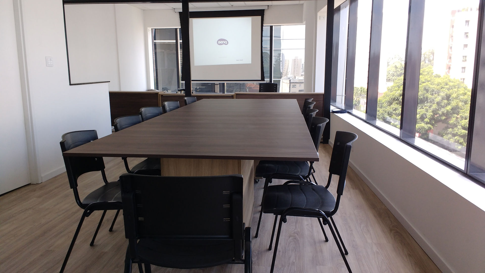 Temos internet de alta velocidade, telefone, projetor e telão, recepcionista bilingue, agenda, impressora, estacionamento e restaurante no prédio, água e café.